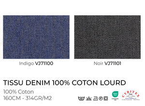 Notre tissu Denim 100% coton brut est disponible en 2 coloris Noir et Indigo sur une largeur de 160 cm.