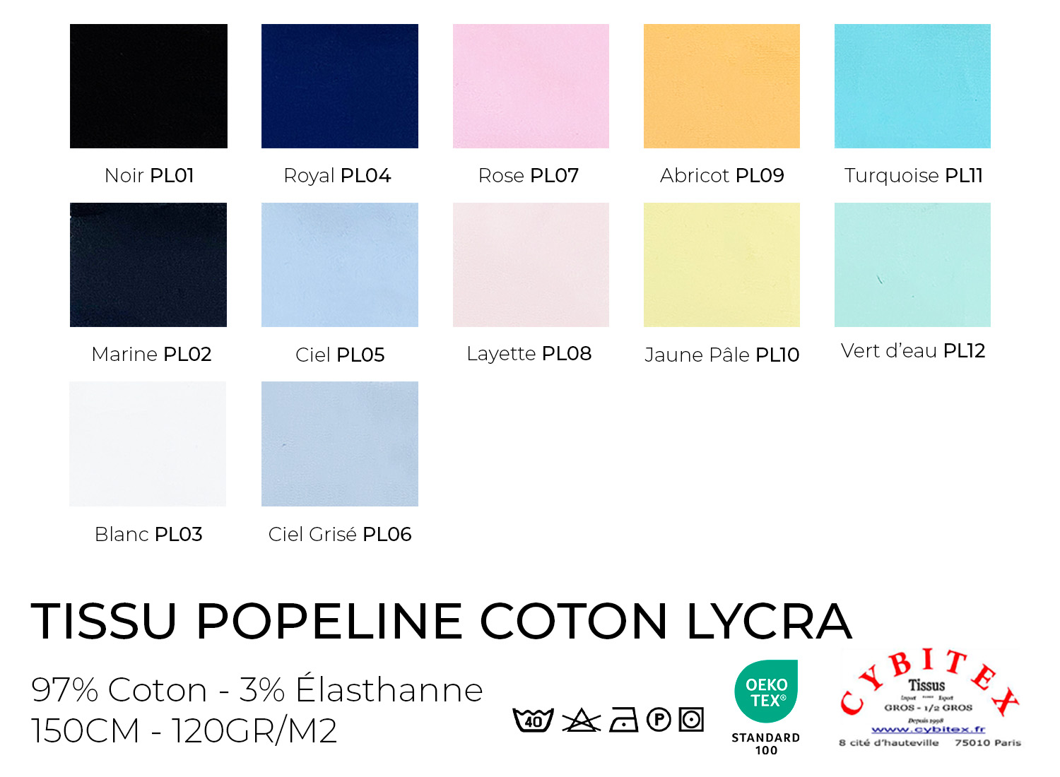 RÉCAPITULATIFS COULEURS : Noir PL01 Marine PL02 Blanc PL03 Royal PL04 Ciel PL05 Ciel Grisé PL06 Rose PL07 Layette PL08 Abricot PL09 Jaune Pâle PL10 Turquoise PL11 Vert d'eau PL12