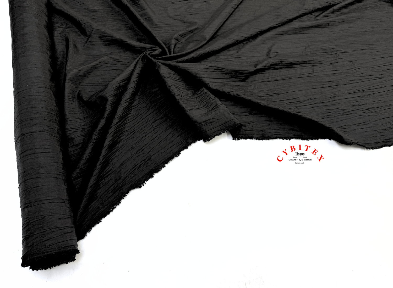 Notre tissu Taffetas Froissé Noire est proposé en 140 centimètres de largeur à partir de 100 Mts.