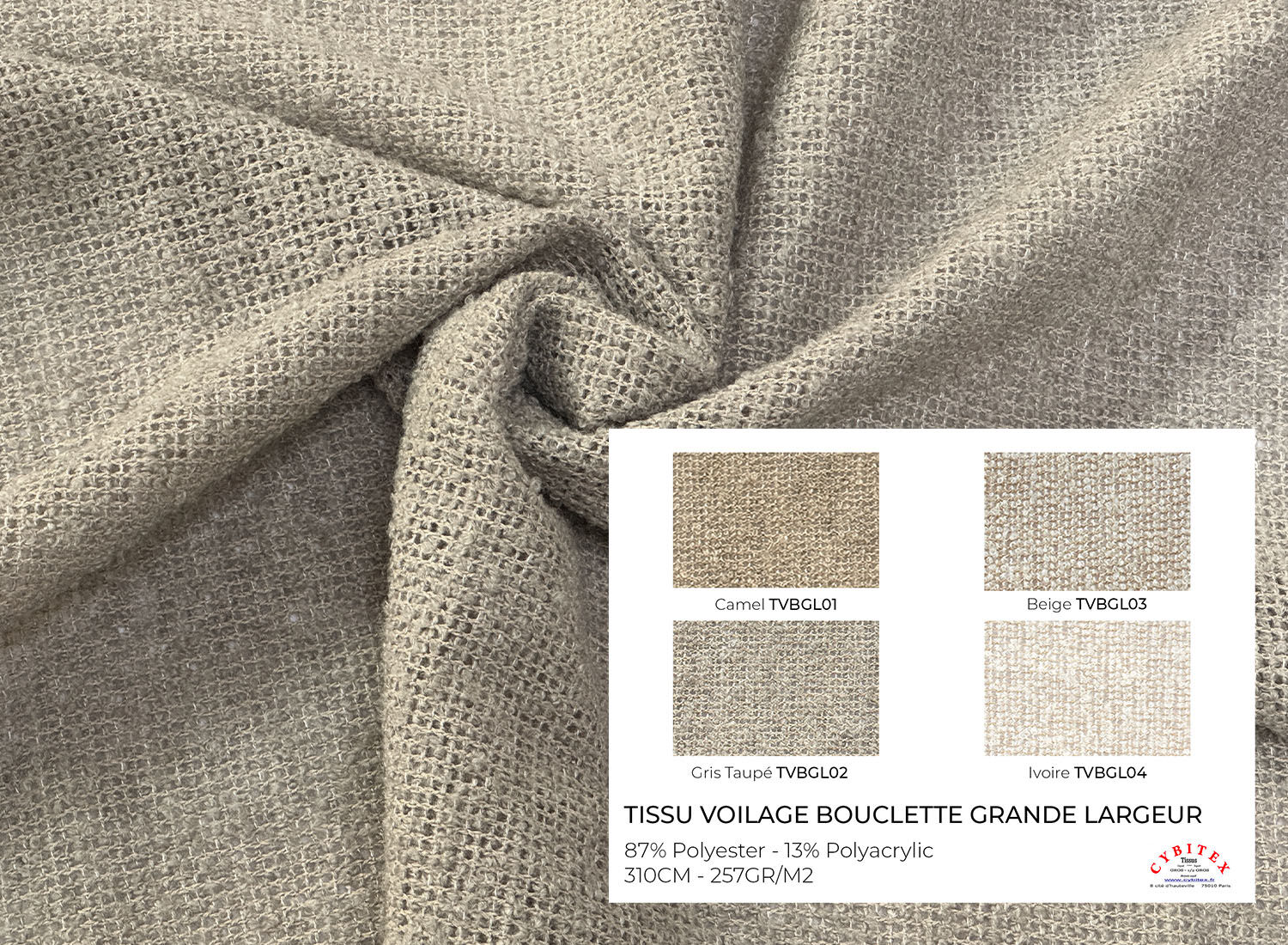 Proposé en rouleaux de 25 mètres, ce voilage bouclette grande largeur est une référence prisée par les tapissiers, décorateurs, ateliers de confection et architectes d’intérieur à la recherche d’un voilage qualitatif au style unique.
