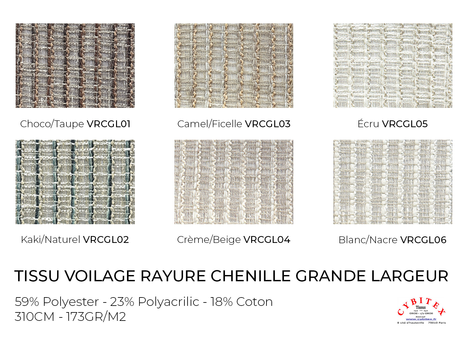 Ce tissu voilage à rayures chenille grande largeur est proposé à la vente en rouleaux, à destination des professionnels de la décoration, tapissiers, couturiers et architectes d’intérieur.