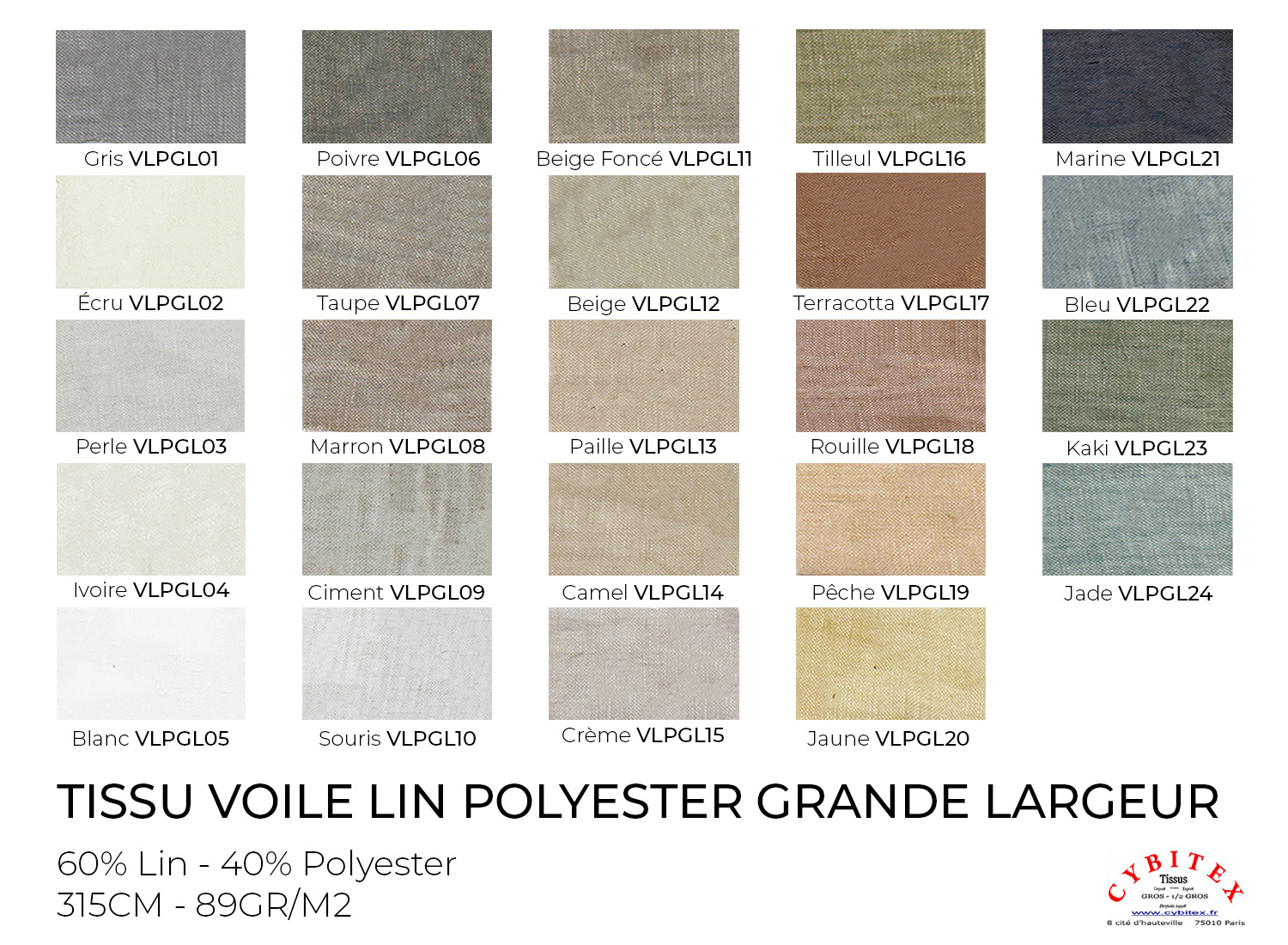 Récapitulatifs Couleurs: Gris VLPGL01 Écru VLPGL02 Perle VLPGL03 Ivoire VLPGL04 Blanc VLPGL05 Poivre VLPGL06 Taupe VLPGL07 Marron VLPGL08 Ciment VLPGL09 Souris VLPGL10 Beige Foncé VLPGL11 Beige VLPGL12 Paille VLPGL13 Camel VLPGL14 Crème VLPGL15 Tilleul VLPGL16 Terracotta VLPGL17 Rouille VLPGL18 Pêche VLPGL19 Jaune VLPGL20 Marine VLPGL21 Bleu VLPGL22 Kaki VLPGL23 Jade VLPGL24